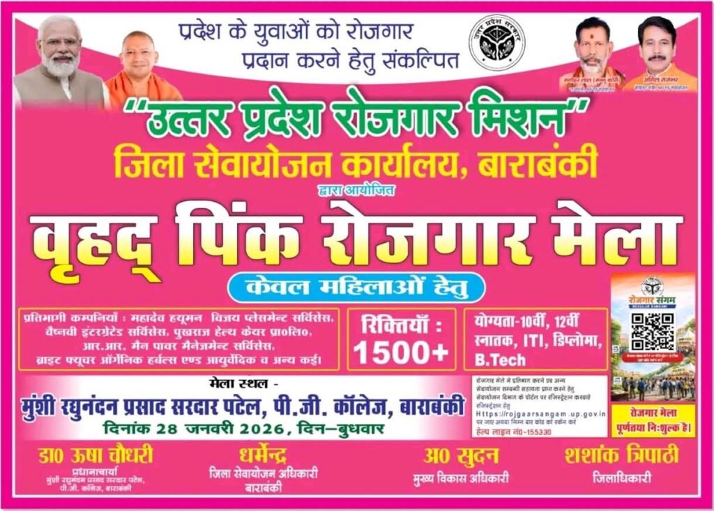 Uttar Pradesh Rojgaar Mela January 2026: बाराबंकी जिला रोजगार कार्यालय महिलाओं के लिए विशेष रोजगार मेला “पिंक रोजगार मेला” आयोजित कर रहा है, जो “उत्तर प्रदेश रोजगार मिशन” का हिस्सा है। इस कार्यक्रम का उद्देश्य पूरे राज्य में महिलाओं के लिए विशेष रूप से रोजगार के अवसर प्रदान करना है।
